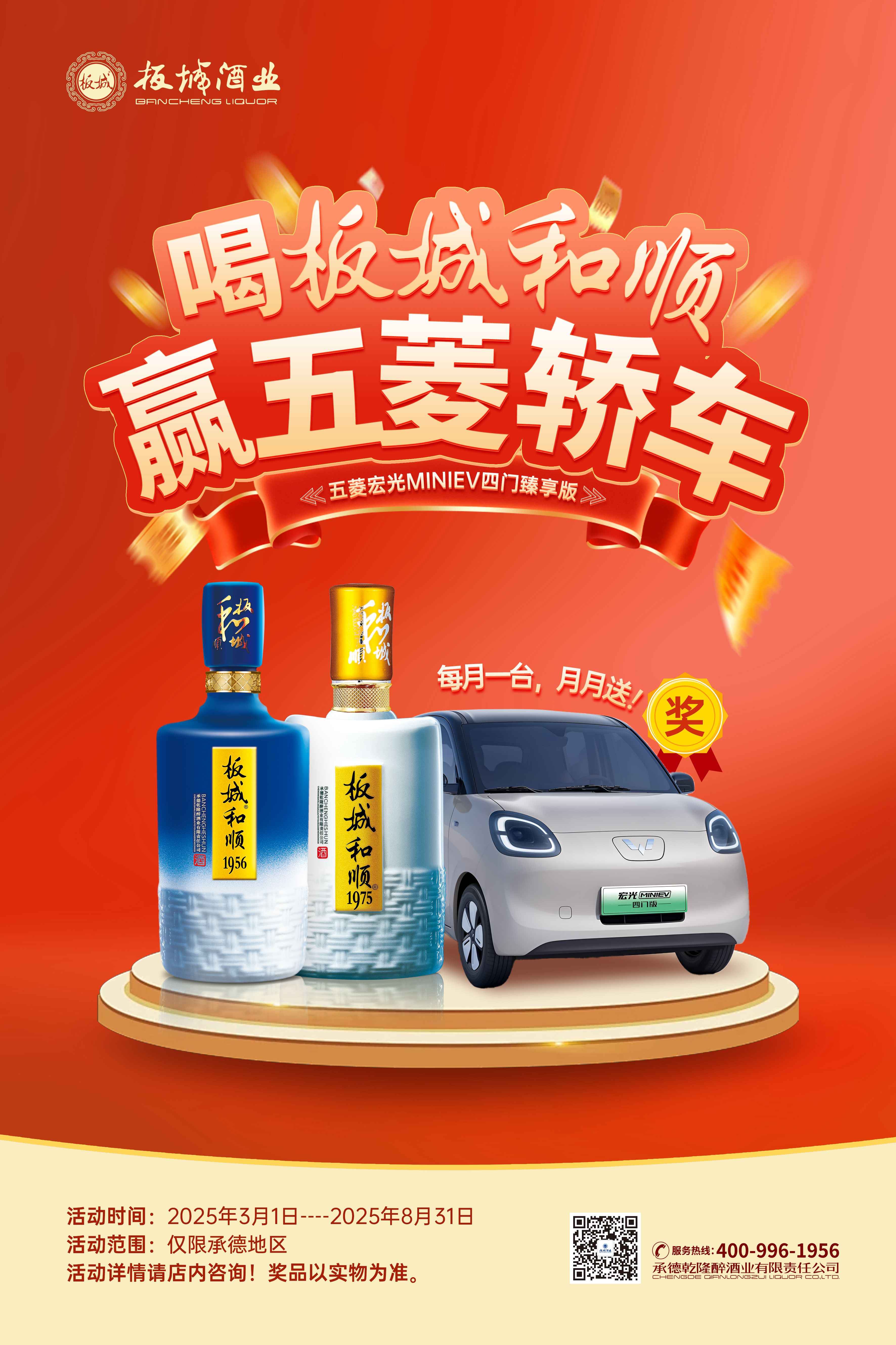 消費(fèi)者在承德區(qū)域購(gòu)買板城和順1975、板城和順1956(不含喜慶版)產(chǎn)品后,掃描瓶蓋內(nèi)二維碼,即可自動(dòng)參與抽獎(jiǎng)。掃碼用戶除享受原有掃碼獎(jiǎng)勵(lì)外,還可額外獲得贏取五菱宏光MINIEV四門臻享版汽車、雅迪電動(dòng)車等重磅獎(jiǎng)品的機(jī)會(huì)。