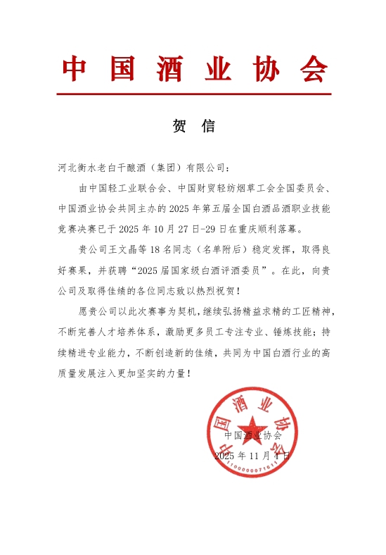 在第五屆全國白酒品酒職業(yè)技能競賽中,衡水老白干及旗下四家子公司18位選手穩(wěn)定發(fā)揮,取得良好賽果,被聘任為“2025屆國家級白酒評酒委員”;其中板城酒業(yè)孫玉玲、劉志強(qiáng)、王金萍、敖冉、亓海波5位選手參加比賽,通過比賽斬獲優(yōu)異成績,均被聘任為“2025屆國家級白酒評酒委員”。板城酒業(yè)成為河北省除衡水老白干酒業(yè)外最多入選人數(shù)的酒企,其中,敖冉、亓海波兩名選手初次參賽獲聘國家級白酒評酒委員。